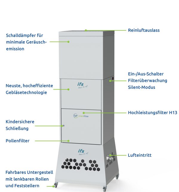 Unsere Virenfilteranlage VF 1200 S ist ideal für den flexiblen Einsatz in Ihren Räumlichkeiten ausgelegt. Die Leichtlaufräder ermöglichen den Virenfilter einfach und entspannt an den Einsatzort zu fahren. Eine Inbetriebnahme ist denkbar leicht. Den Stecker in eine haushaltsübliche 230 V Steckdose einstecken, Virenfilter einschalten und schon startet er damit, die Raumluft von Pollen, Hausstaub, Bakterien und Viren zu reinigen. Der VF 1200 S ist mit einem zusätzlichen Schalldämpfer ausgestattet, der den Geräuschpegel um 4 dB(A) reduziert. Darüber hinaus kann per Knopfdruck der Flüster-Modus aktiviert werden. Hierdurch wird ein Geräuschpegel von flüsterleisen 37 dB(A) erreicht. Unsere integrierte Filterüberwachung prüft permanent den Zustand der Filterelemente und signalisiert dies über eine optische Anzeige.